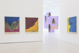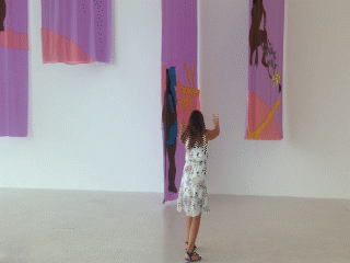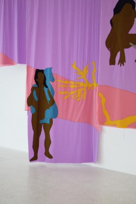 "Coexisting is inspired by Octavia Butler’s sci-fi book series Lilith’s Brood from the late 1980s in which a nuclear war left the planet uninhabitable. Hybrid beings called the Oankali have made it their mission to refertilize the Earth for humans to survive on it once again. In return, they demand a “gene trade” in order to undo humankind’s fatal combination of intelligence and hierarchical tendencies. Building on this plot, Sophie Utikal’s textile series constitutes a speculative vision of post-apocalyptic life on Earth. It proposes more humble and compassionate forms of coexistence between different life forms, depicting a figure who engages in various ways with their natural habitat. In one of the four panels, we see them grieving for the destruc- tion of the planet, whereas in another, they become entangled with an animal-like creature, indicating an idiosyncratic interspecies relationship. In a third, the figure studies different kinds of fungi as if opening up to the wisdoms of the myriad organisms in the soil. This rejec- tion of the dualism between human and nature is accentuated by the work’s technique: the very act of sewing implies the conflation of formerly divided entities. Similarly, the stream that seems to flow across and thereby connect all four parts renders each incomplete without the others and refutes any sense of hierarchy."