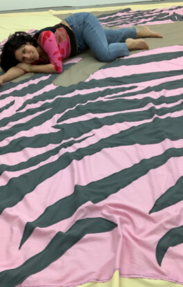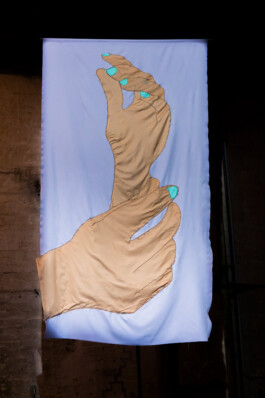 "FULL MELT DOWN is a choreographed guided tour through a radically soft space. Works by Berlin based textile artist Sophie Utikal hover in the room: they can be sensed, caressed, or used to hide behind. A gentle soundscape composed by Zosia Holubowska cocoons the visitors´s ears. There is a field of bean bags where one can rest, and a library corner for reading in peace. As they are (con)sensually lead from one intimate experience to another, the guests are encouraged to follow their intuition: would you like to put on headphones and listen to the sound of your breath? Do you want to feel needles and ink penetrating your skin? Would you prefer to wander around on your own and meet again later?