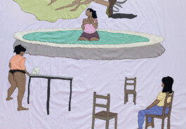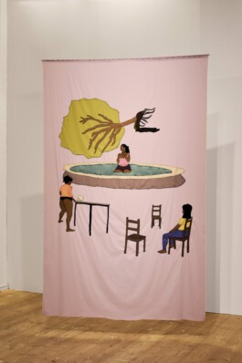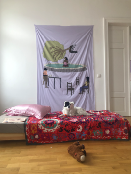 Sophie Utikal’s textile piece explores the sensations of belonging and displacement in the encounter with an unknown future. The interruption of everyday life emerges in her work as an atmosphere of constant and conflict-ridden negotiation with passivity. The arrangement of the characters evokes the forced physical distancing and the disruption of the tactile currently being imposed on interpersonal relations, addressing the effects that the pandemic has had on our emotions, feelings, and behaviors.